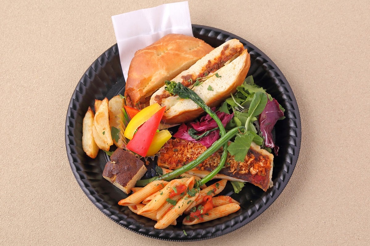 庄内牛フォカッチャサンド/ベビーリーフサラダ/お魚のパン粉焼き