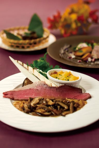 洋  食  ローストビーフ 木の子ソース ズイキ芋のグラタン添
