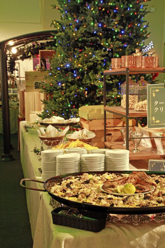 クリスマス一色の館内でビールやシャンパン、カクテルなど豊富な種類のドリンクと