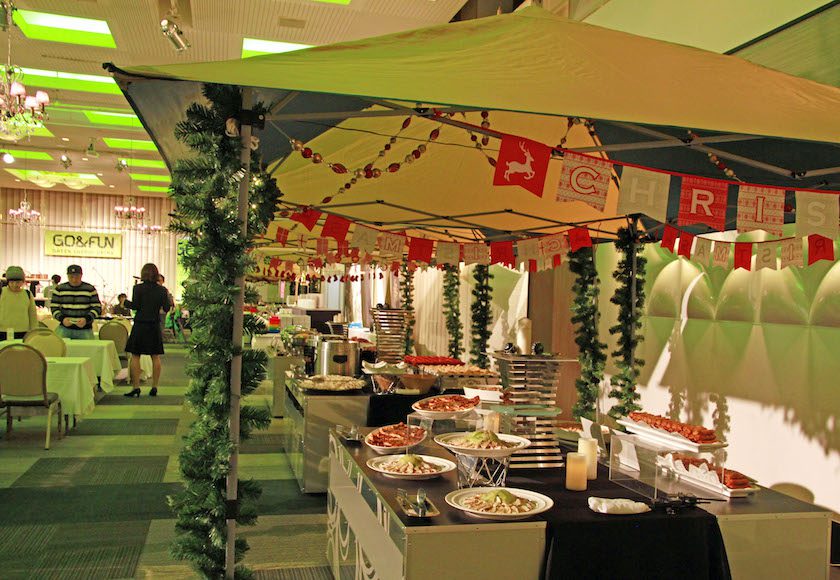 クリスマス一色の館内でビールやシャンパン、カクテルなど豊富な種類のドリンクと