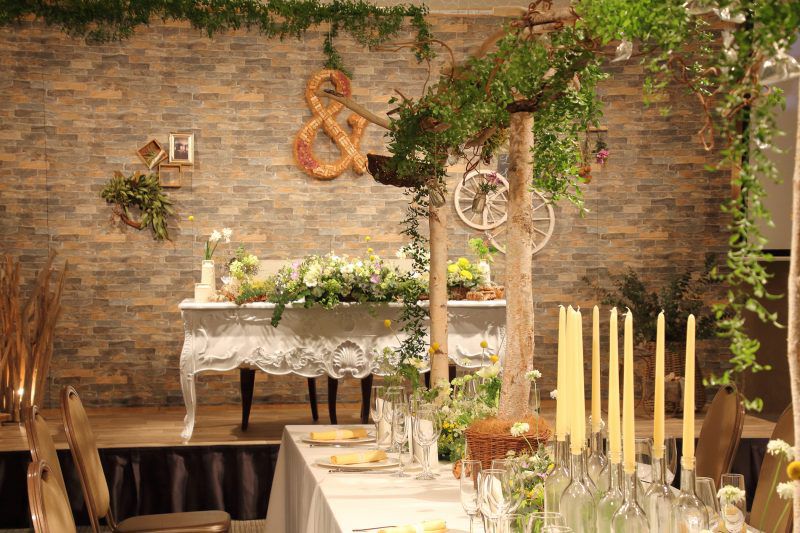 レンガ調をモチーフにした高砂テーブルに、ワインボトルやコルクを取り入れたおしゃれスタイル![]()