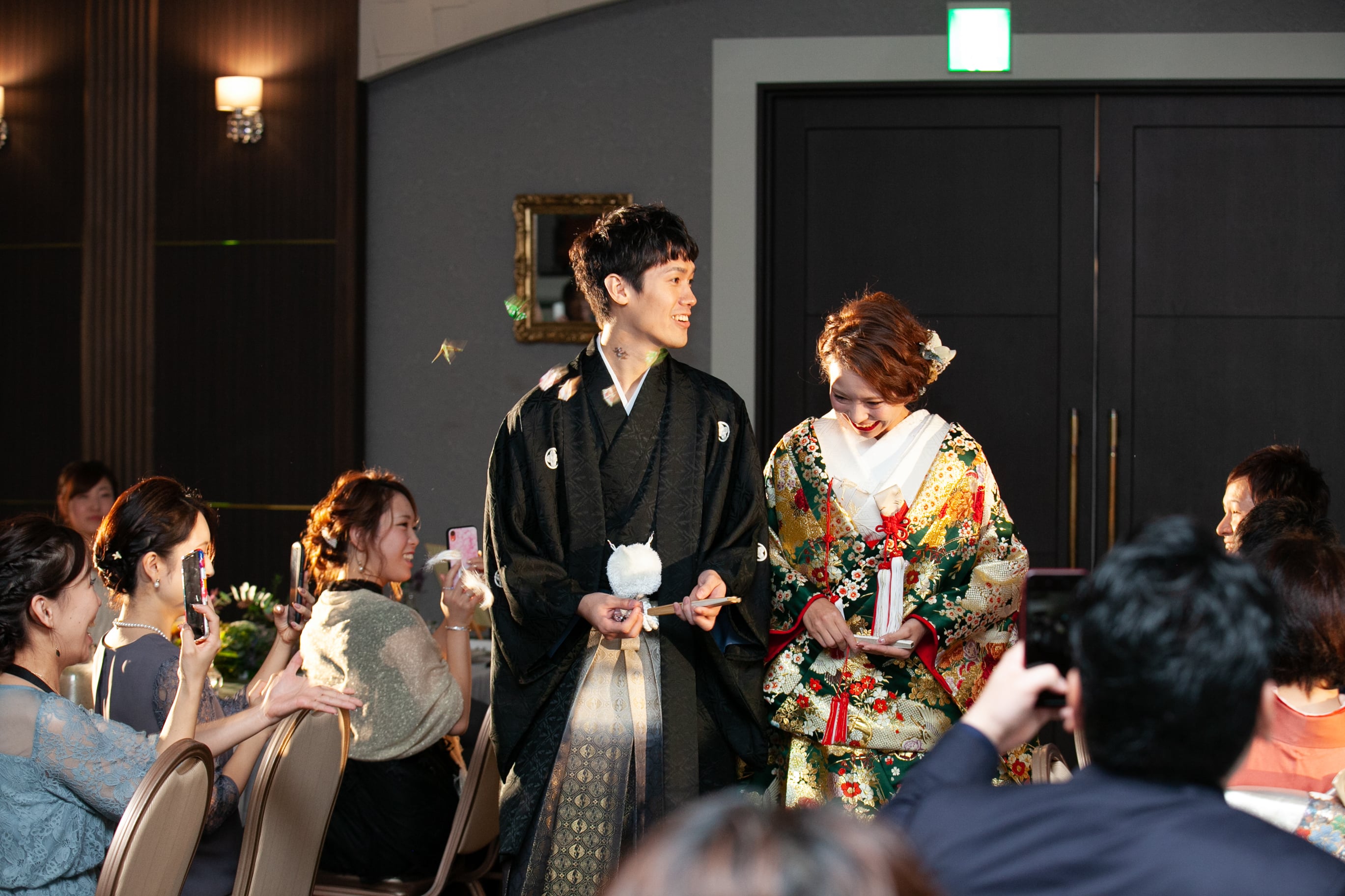 神前挙式後に折り鶴シャワーをすることが多いですが、和装入場で行うのも盛り上がりますよ![]()
