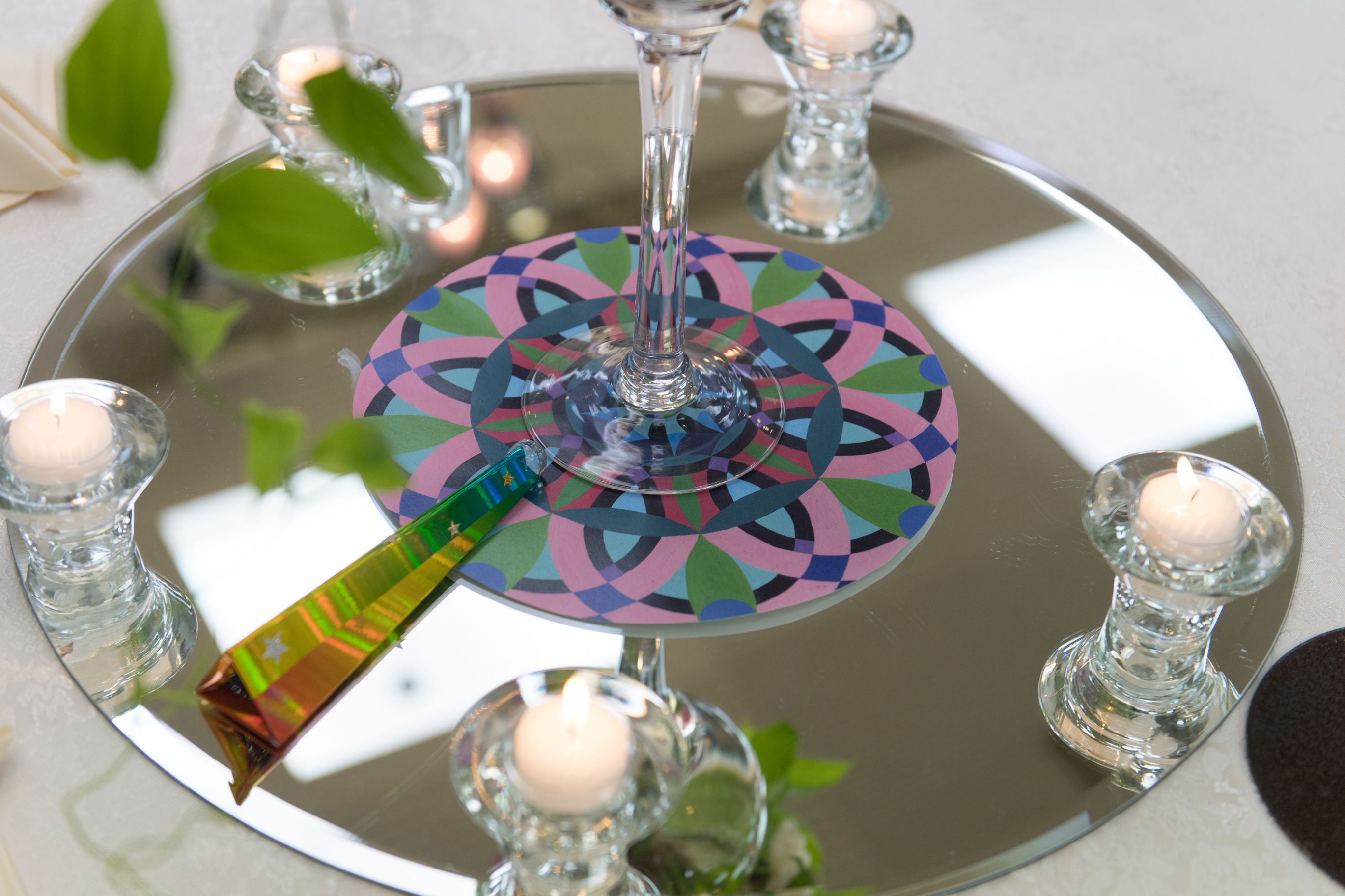 会場の各テーブルには、新婦さんのお母様の手づくり万華鏡を置き、