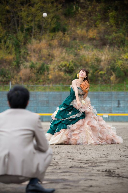 新婦さんは野球チームのテーマカラーでもある、緑と赤のカラードレスを選びました![]()