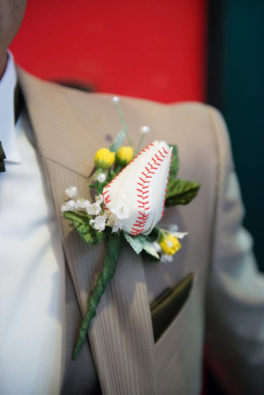 新郎さんのブートニアには野球ボールのデザインのブートニアをチョイス![]()