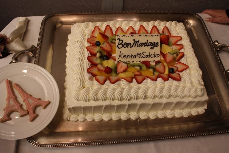 ウェディングケーキ入刀前には、思い出のエッフェル塔のカタチをした
