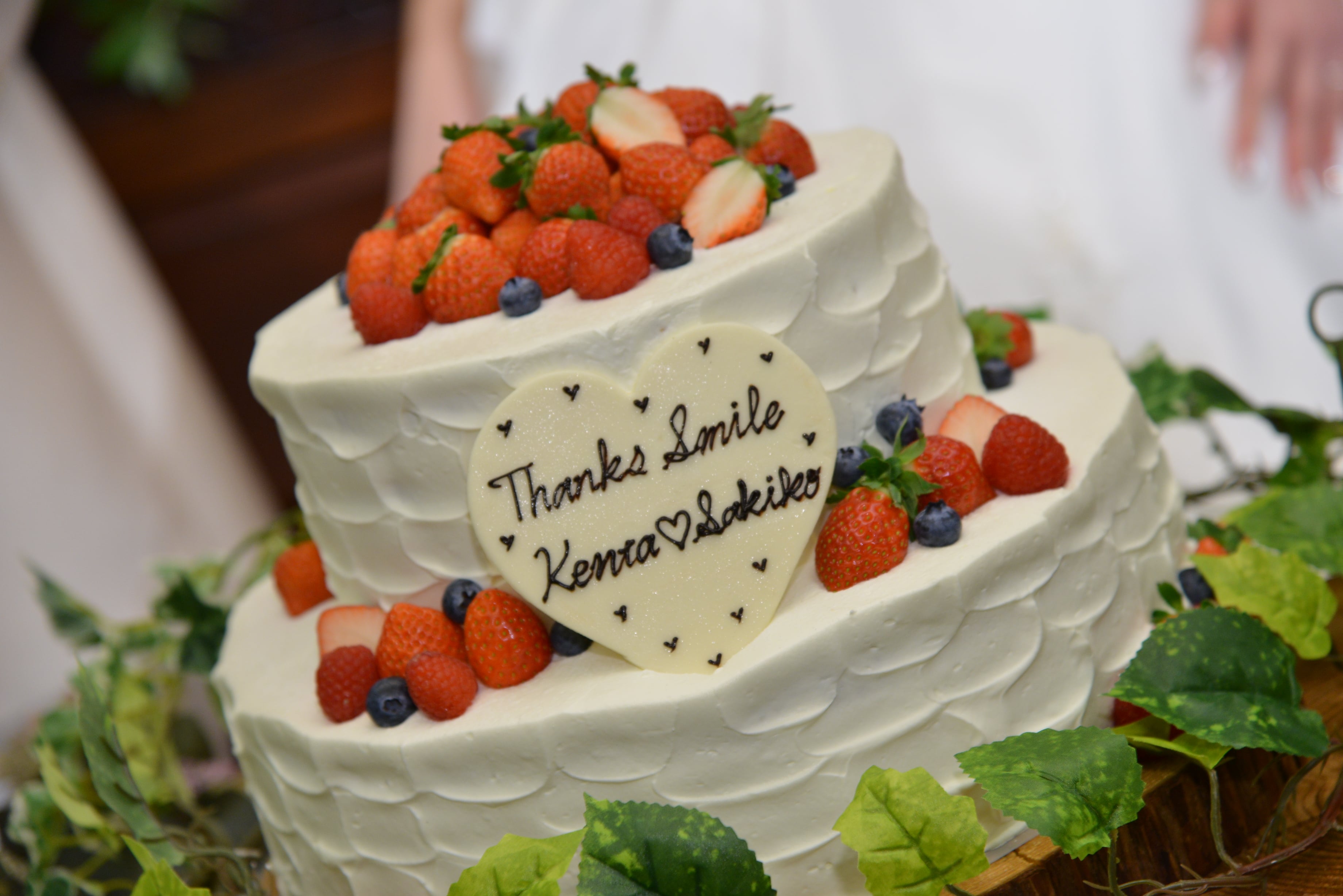 写真スポットでもあるウェディングケーキには『Thanks smile』のメッセージをのせて![]()