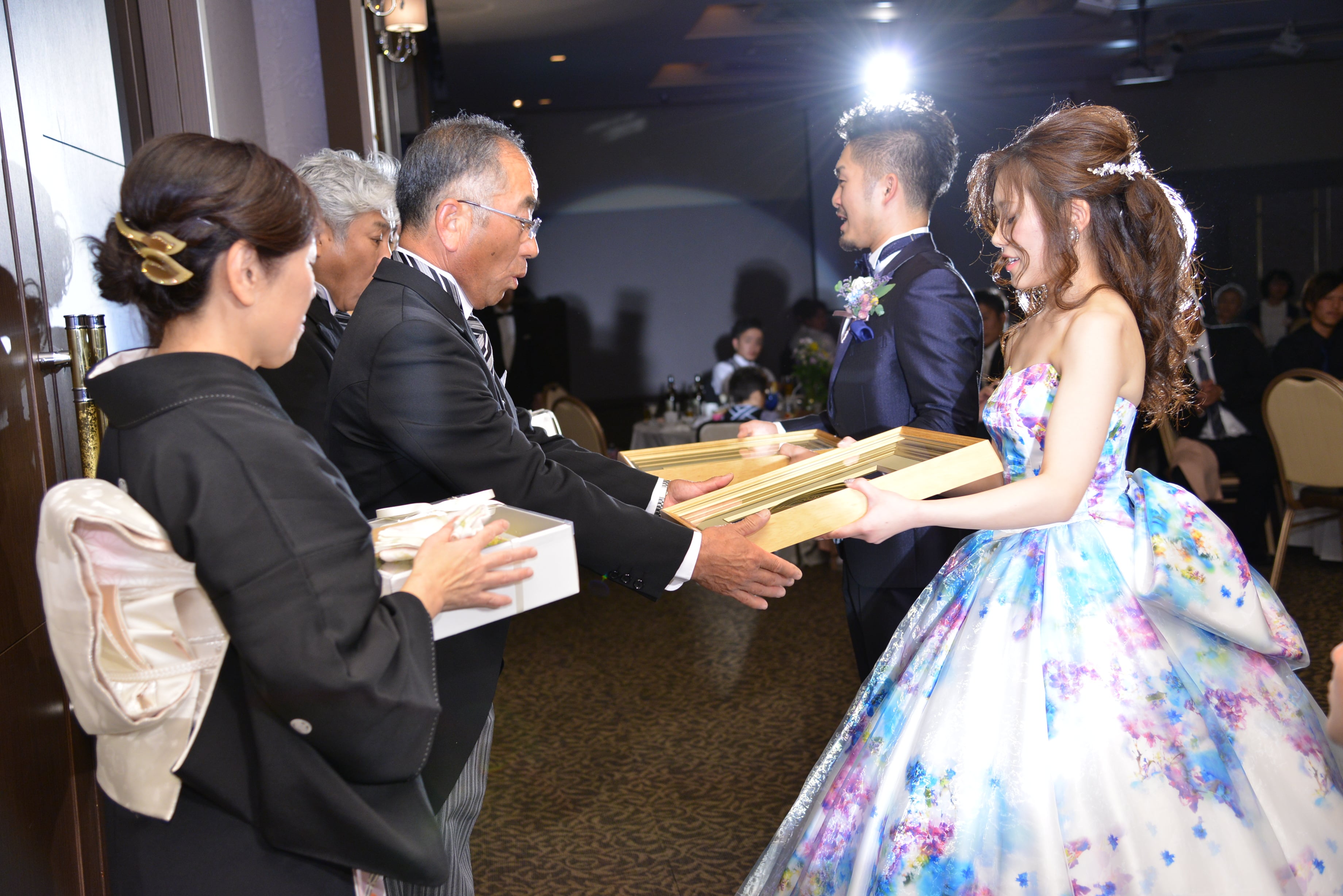 両親への手紙のあとは、古くから家族の象徴として大切に守り、代々伝えられてきた家紋を額にしてプレゼントしました![]()
